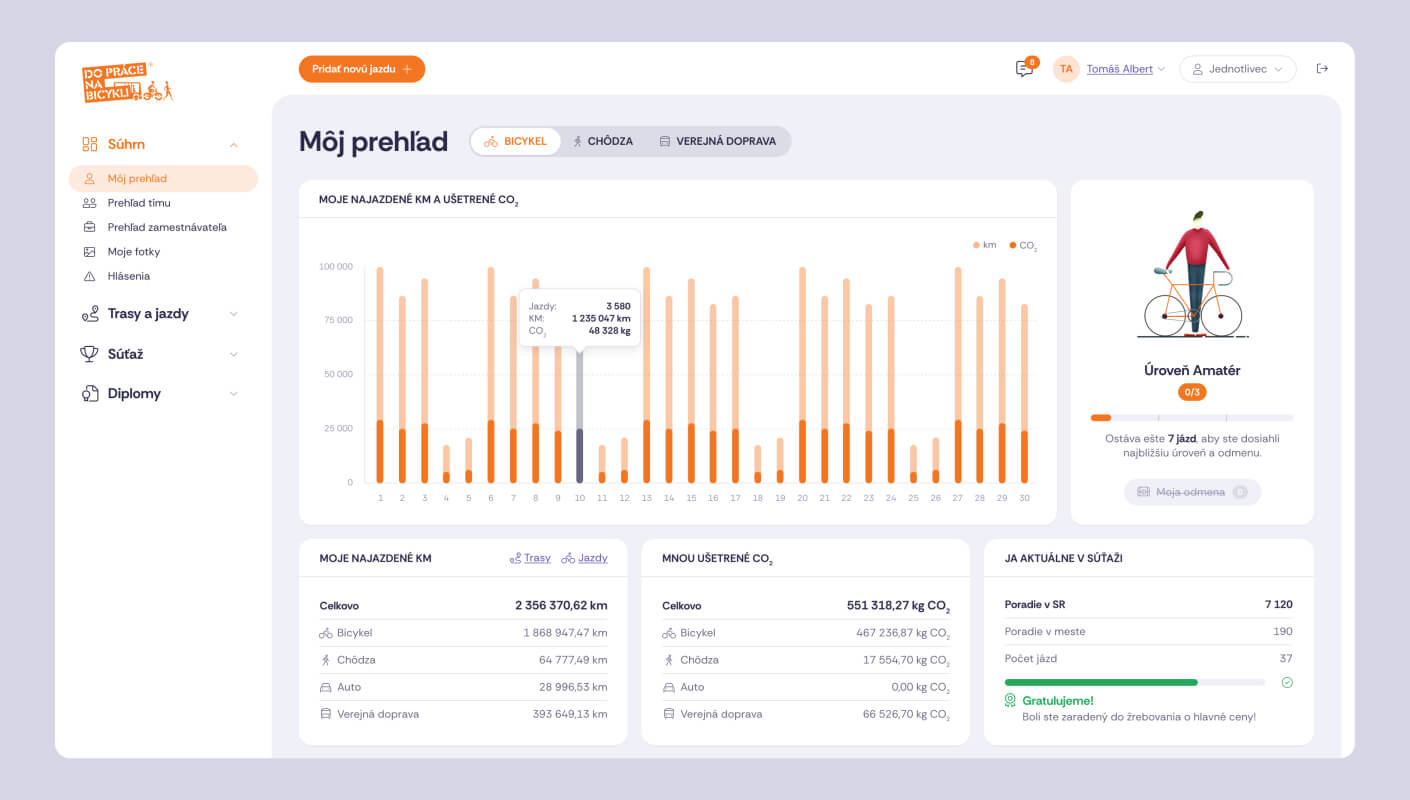 Bike to Work is a campaign promoting sustainable transport across Slovakia. Every year, during June, it organizes a nationwide challenge that encourages employees from public institutions and private companies to ride bicycles to work instead of driving. The initiative combines health, ecology, and community, all powered by a digital system that tracks participation and impact.